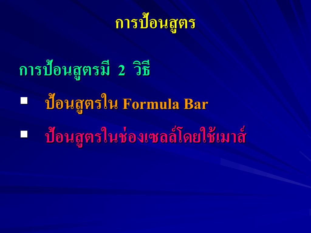การป้อนสูตร การป้อนสูตรมี 2 วิธี • ป้อนสูตรใน Formula Bar • ป้อนสูตรในช่องเซลล์โดยใช้เมาส์