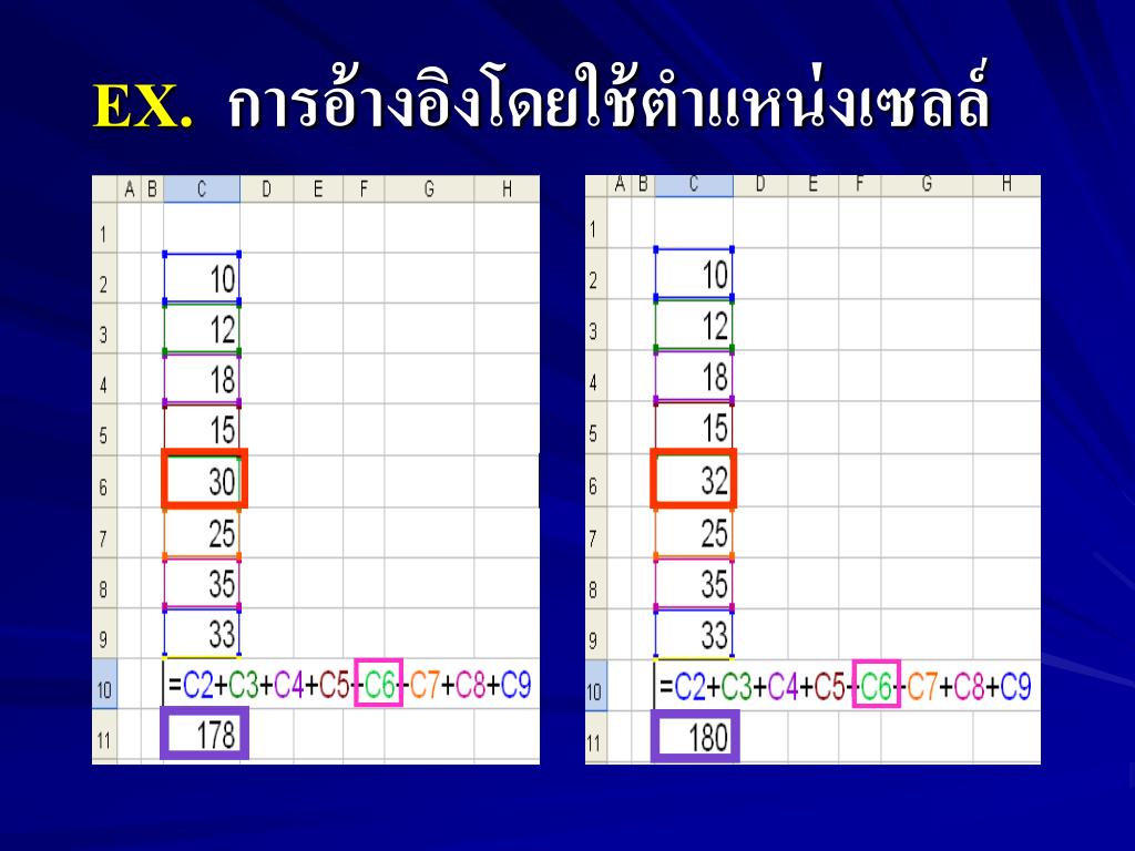 กรณีที่ใช้จำนวนจริงแทนการอ้างอิงเซลล์ในการ กรณีที่ใช้จำนวนจริงแทนการอ้างอิงเซลล์ในการ กำหนดสูตร เมื่อค่าของจำนวนนั้นๆ มีการเปลี่ยนแปลง ผลลัพธ์ที่ได้จะไม่เปลี่ยนแปลงตาม แต่หากใช้การอ้างอิง ตำแหน่งเซลล์ เมื่อมีการเปลี่ยนแปลงจำนวนในช่องเซลล์ นั้นๆ ผลลัพธ์ที่ได้จะเปลี่ยนแปลงตามไปด้วย