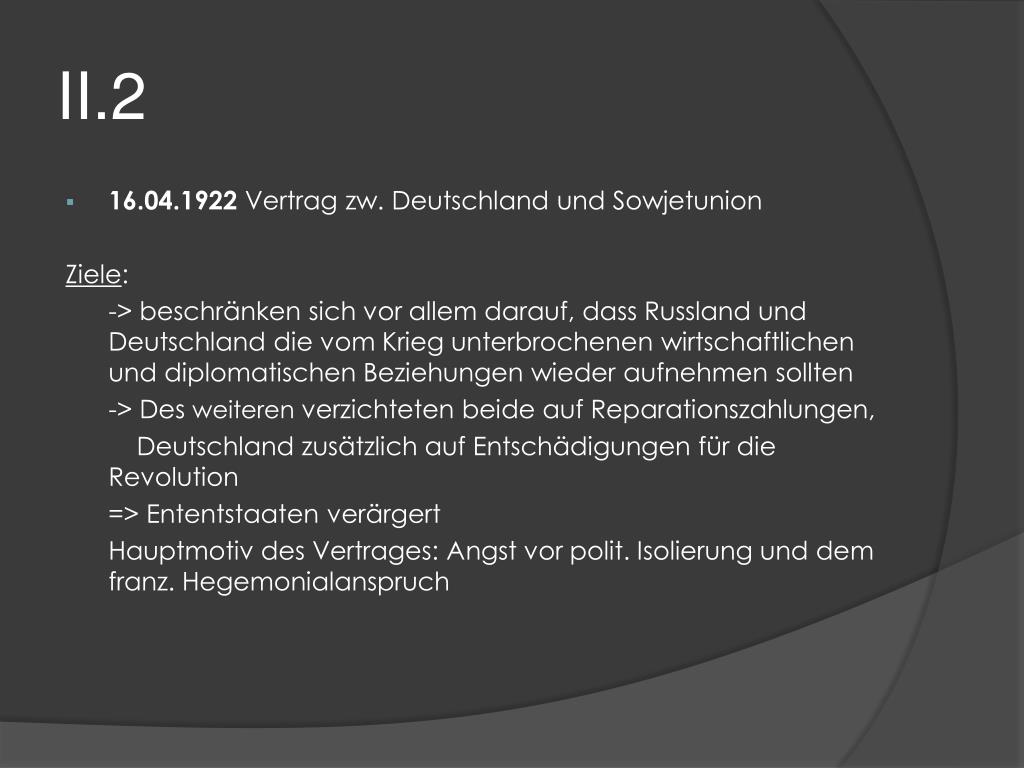II.2 • 16.04.1922 Vertrag zw. Deutschland und Sowjetunion Ziele: -> beschränken sich vor allem darauf, dass Russland und Deutschland die vom Krieg unterbrochenen wirtschaftlichen und diplomatischen Beziehungen wieder aufnehmen sollten -> Des weiteren verzichteten beide auf Reparationszahlungen, Deutschland zusätzlich auf Entschädigungen für die Revolution => Ententstaaten verärgert Hauptmotiv des Vertrages: Angst vor polit. Isolierung und dem franz. Hegemonialanspruch