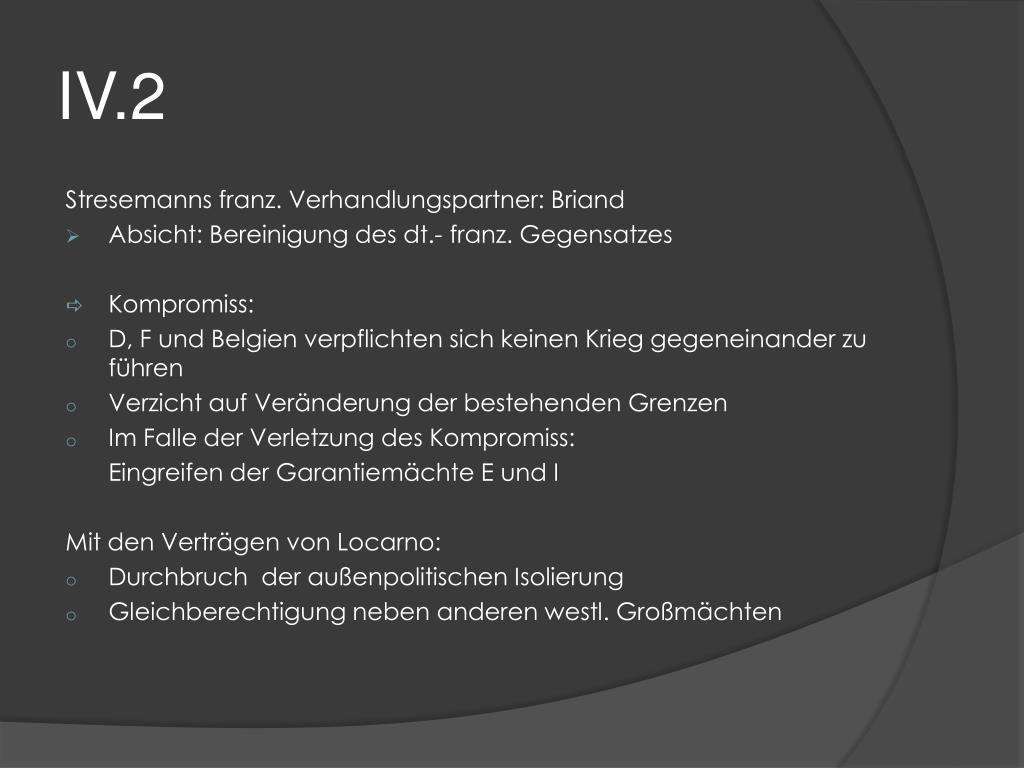 IV.2 Stresemanns franz. Verhandlungspartner: Briand • Absicht: Bereinigung des dt.- franz. Gegensatzes • Kompromiss: • D, F und Belgien verpflichten sich keinen Krieg gegeneinander zu führen • Verzicht auf Veränderung der bestehenden Grenzen • Im Falle der Verletzung des Kompromiss: Eingreifen der Garantiemächte E und I Mit den Verträgen von Locarno: • Durchbruch der außenpolitischen Isolierung • Gleichberechtigung neben anderen westl. Großmächten
