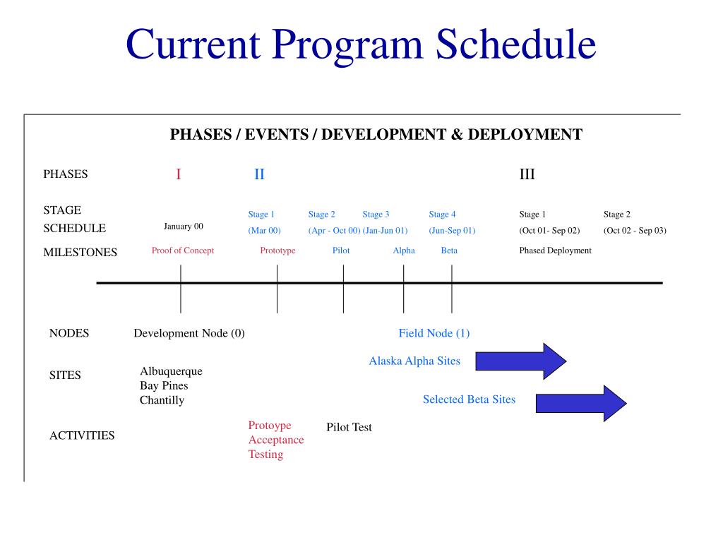 Current Program Schedule PHASES / EVENTS / DEVELOPMENT & DEPLOYMENT I II III PHASES STAGE Stage 1 (Mar 00) Stage 2 (Apr - Oct 00) Stage 3 (Jan-Jun 01) Stage 4 (Jun-Sep 01) Stage 1 (Oct 01- Sep 02) Stage 2 (Oct 02 - Sep 03) SCHEDULE January 00 MILESTONES Proof of Concept Prototype Pilot Alpha Beta Phased Deployment NODES Development Node (0) Field Node (1) Alaska Alpha Sites SITES Albuquerque Bay Pines Chantilly Selected Beta Sites Pilot Test Protoype Acceptance Testing ACTIVITIES