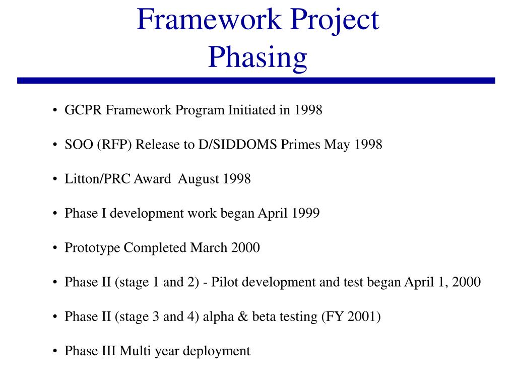 Framework Project Phasing • GCPR Framework Program Initiated in 1998 • SOO (RFP) Release to D/SIDDOMS Primes May 1998 • Litton/PRC Award August 1998 • Phase I development work began April 1999 • Prototype Completed March 2000 • Phase II (stage 1 and 2) - Pilot development and test began April 1, 2000 • Phase II (stage 3 and 4) alpha & beta testing (FY 2001) • Phase III Multi year deployment