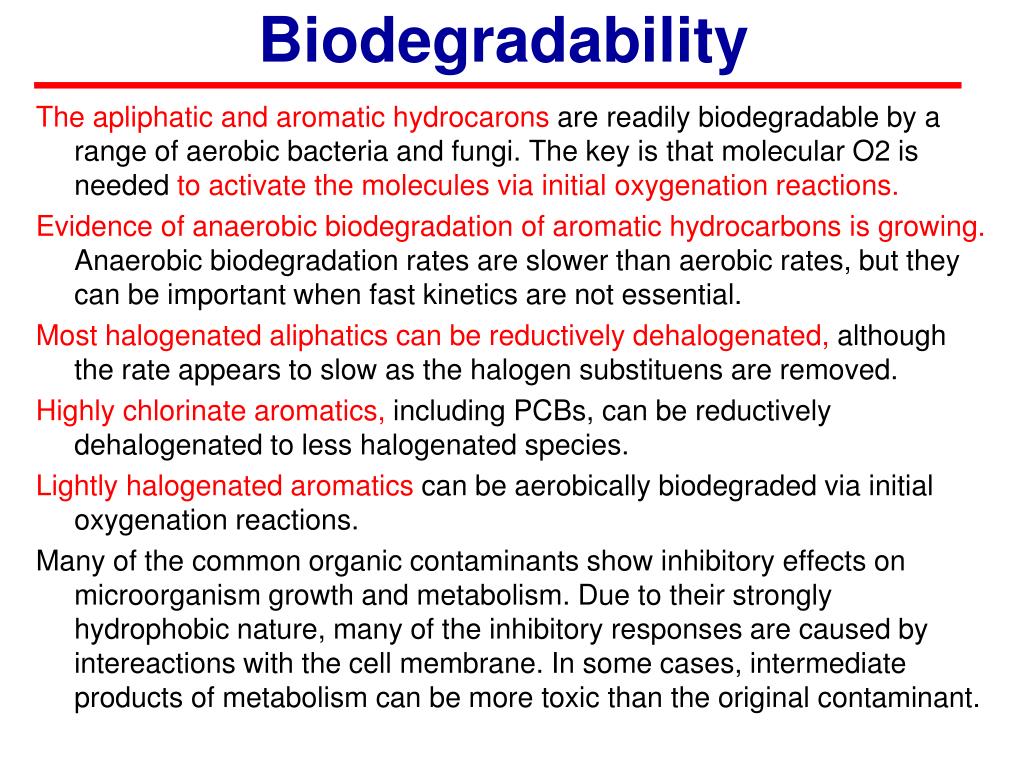 Biodegradability The apliphatic and aromatic hydrocarons are readily biodegradable by a range of aerobic bacteria and fungi. The key is that molecular O2 is needed to activate the molecules via initial oxygenation reactions. Evidence of anaerobic biodegradation of aromatic hydrocarbons is growing. Anaerobic biodegradation rates are slower than aerobic rates, but they can be important when fast kinetics are not essential. Most halogenated aliphatics can be reductively dehalogenated, although the rate appears to slow as the halogen substituens are removed. Highly chlorinate aromatics, including PCBs, can be reductively dehalogenated to less halogenated species. Lightly halogenated aromatics can be aerobically biodegraded via initial oxygenation reactions. Many of the common organic contaminants show inhibitory effects on microorganism growth and metabolism. Due to their strongly hydrophobic nature, many of the inhibitory responses are caused by intereactions with the cell membrane. In some cases, intermediate products of metabolism can be more toxic than the original contaminant.