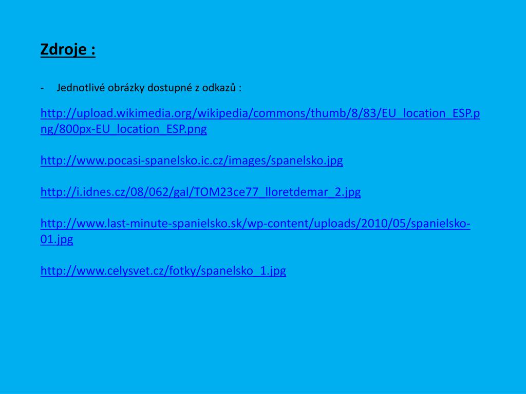 Zdroje : • Jednotlivé obrázky dostupné z odkazů : • http://upload.wikimedia.org/wikipedia/commons/thumb/8/83/EU_location_ESP.png/800px-EU_location_ESP.png • http://www.pocasi-spanelsko.ic.cz/images/spanelsko.jpg • http://i.idnes.cz/08/062/gal/TOM23ce77_lloretdemar_2.jpg • http://www.last-minute-spanielsko.sk/wp-content/uploads/2010/05/spanielsko-01.jpg • http://www.celysvet.cz/fotky/spanelsko_1.jpg