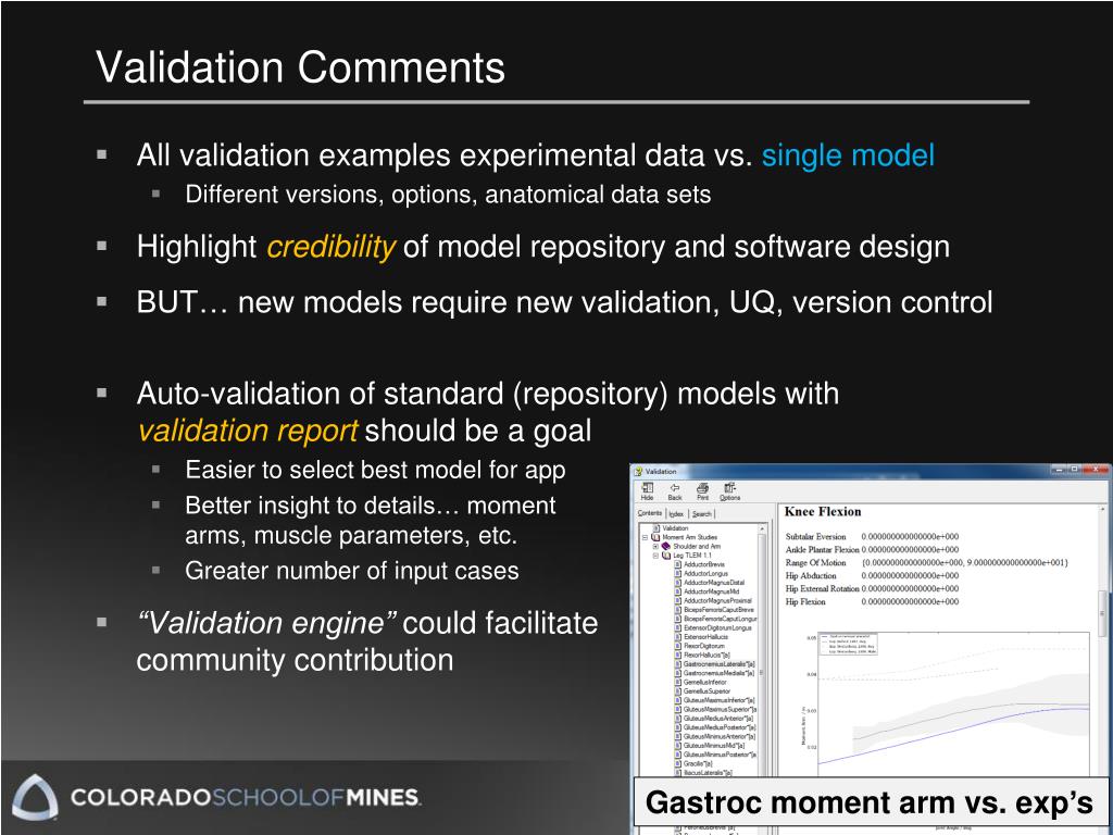 Validation Comments • All validation examples experimental data vs. single model • Different versions, options, anatomical data sets • Highlight credibility of model repository and software design • BUT… new models require new validation, UQ, version control • Auto-validation of standard (repository) models withvalidation report should be a goal • Easier to select best model for app • Better insight to details… momentarms, muscle parameters, etc. • Greater number of input cases • “Validation engine” could facilitatecommunity contribution Gastroc moment arm vs. exp’s