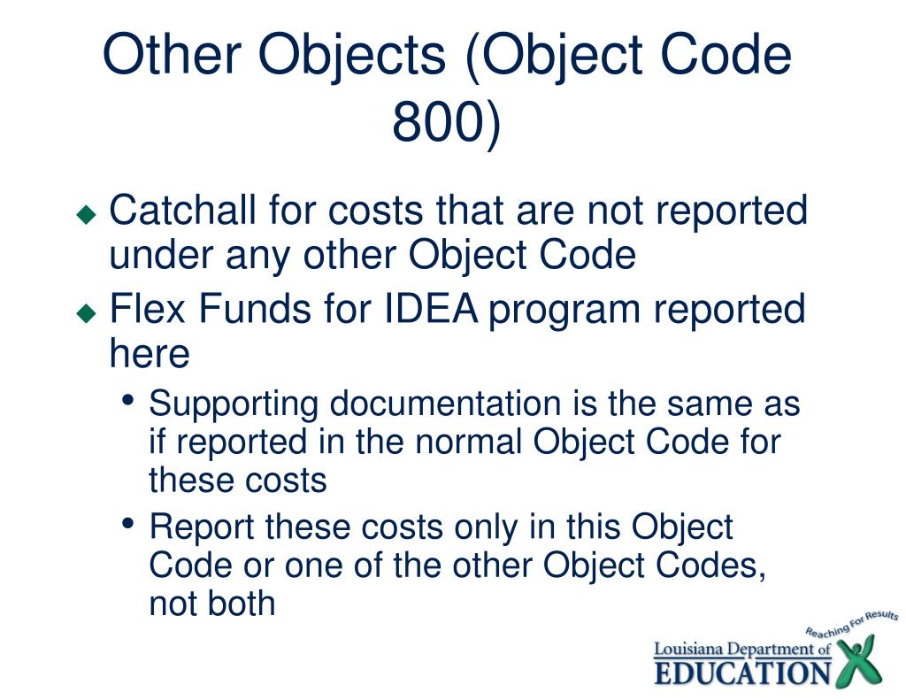 Other Objects (Object Code 800) • Catchall for costs that are not reported under any other Object Code • Flex Funds for IDEA program reported here • Supporting documentation is the same as if reported in the normal Object Code for these costs • Report these costs only in this Object Code or one of the other Object Codes, not both
