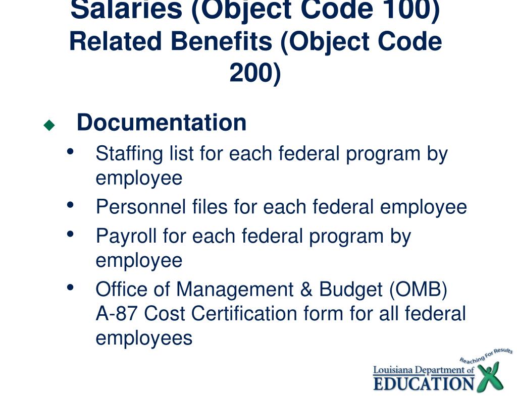 Salaries (Object Code 100)Related Benefits (Object Code 200) • Documentation • Staffing list for each federal program by employee • Personnel files for each federal employee • Payroll for each federal program by employee • Office of Management & Budget (OMB) A-87 Cost Certification form for all federal employees