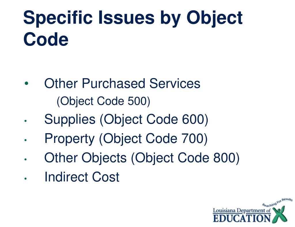 Specific Issues by Object Code • Other Purchased Services (Object Code 500) • Supplies (Object Code 600) • Property (Object Code 700) • Other Objects (Object Code 800) • Indirect Cost