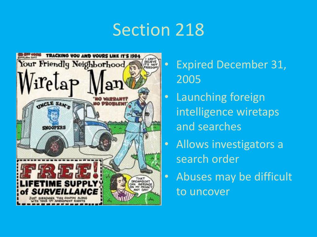 Section 218 • Expired December 31, 2005 • Launching foreign intelligence wiretaps and searches • Allows investigators a search order • Abuses may be difficult to uncover