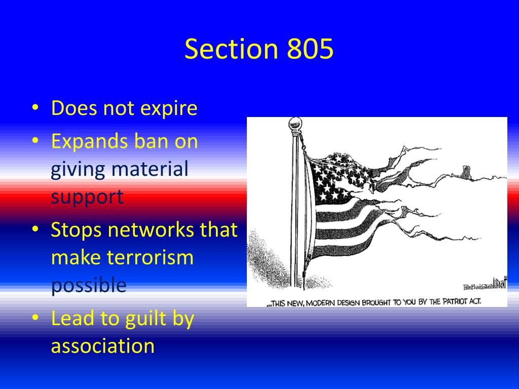 Section 805 • Does not expire • Expands ban on giving material support • Stops networks that make terrorism possible • Lead to guilt by association