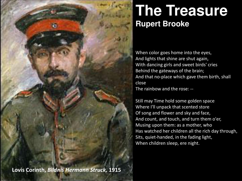 WORLD WAR I Poets & Artists . Mackenzie Hunt, Robert Mclaughlin , Tyler Ratcliff, Katherine Ruhm. The Treasure Rupert Brooke. When color goes home into the eyes, And lights that shine are shut again, With dancing girls and sweet birds' cries Behind the gateways of the brain;