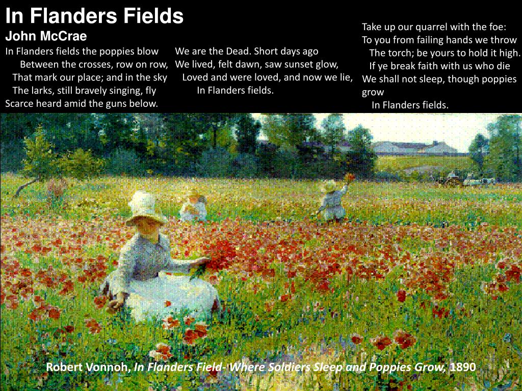 In Flanders Fields John McCrae Take up our quarrel with the foe: To you from failing hands we throw The torch; be yours to hold it high. If ye break faith with us who die We shall not sleep, though poppies grow In Flanders fields. We are the Dead. Short days ago We lived, felt dawn, saw sunset glow, Loved and were loved, and now we lie, In Flanders fields. In Flanders fields the poppies blow Between the crosses, row on row, That mark our place; and in the sky The larks, still bravely singing, fly Scarce heard amid the guns below. Robert Vonnoh, In Flanders Field- Where Soldiers Sleep and Poppies Grow, 1890