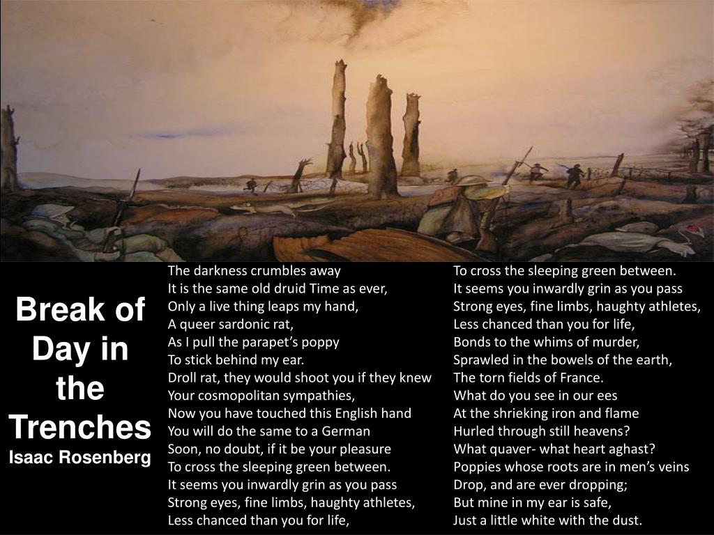 Photograph: National Army Museum The darkness crumbles away It is the same old druid Time as ever, Only a live thing leaps my hand, A queer sardonic rat, As I pull the parapet’s poppy To stick behind my ear. Droll rat, they would shoot you if they knew Your cosmopolitan sympathies, Now you have touched this English hand You will do the same to a German Soon, no doubt, if it be your pleasure To cross the sleeping green between. It seems you inwardly grin as you pass Strong eyes, fine limbs, haughty athletes, Less chanced than you for life, To cross the sleeping green between. It seems you inwardly grin as you pass Strong eyes, fine limbs, haughty athletes, Less chanced than you for life, Bonds to the whims of murder, Sprawled in the bowels of the earth, The torn fields of France. What do you see in our ees At the shrieking iron and flame Hurled through still heavens? What quaver- what heart aghast? Poppies whose roots are in men’s veins Drop, and are ever dropping; But mine in my ear is safe, Just a little white with the dust. Break of Day in the Trenches Isaac Rosenberg