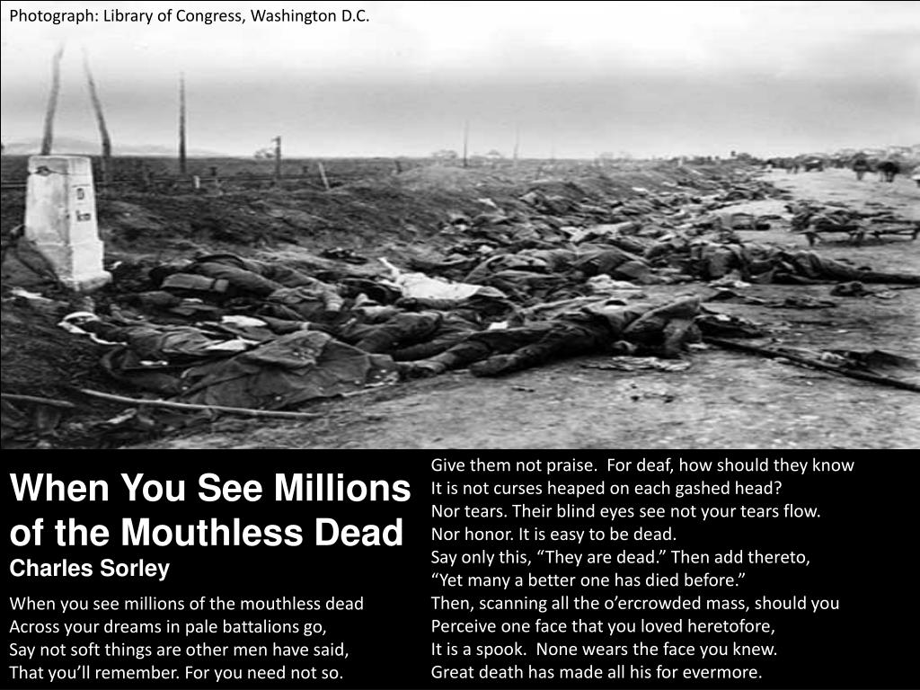 Photograph: Library of Congress, Washington D.C. Give them not praise. For deaf, how should they know It is not curses heaped on each gashed head? Nor tears. Their blind eyes see not your tears flow. Nor honor. It is easy to be dead. Say only this, “They are dead.” Then add thereto, “Yet many a better one has died before.” Then, scanning all the o’ercrowded mass, should you Perceive one face that you loved heretofore, It is a spook. None wears the face you knew. Great death has made all his for evermore. When You See Millions of the Mouthless Dead Charles Sorley When you see millions of the mouthless dead Across your dreams in pale battalions go, Say not soft things are other men have said, That you’ll remember. For you need not so.
