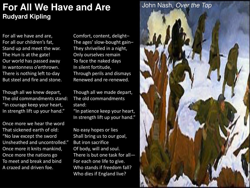 For All We Have and Are Rudyard Kipling John Nash, Over the Top For all we have and are, For all our children’s fat, Stand up and meet the war. The Hun is at the gate! Our world has passed away In wantonness o’erthrown. There is nothing left to-day But steel and fire and stone. Though all we knew depart, The old commandments stand: “In courage keep your heart, In strength lift up your hand.” Once more we hear the word That sickened earth of old: “No law except the sword Unsheathed and uncontrolled.” Once more it knits mankind, Once more the nations go To meet and break and bind A crazed and driven foe. Comfort, content, delight– The ages’ slow-bought gain– They shrivelled in a night, Only ourselves remain To face the naked days In silent fortitude, Through perils and dismays Renewed and re-renewed. Though all we made depart, The old commandments stand: “In patience keep your heart, In strength lift up your hand.” No easy hopes or lies Shall bring us to our goal, But iron sacrifice Of body, will and soul. There is but one task for all— For each one life to give. Who stands if freedom fall? Who dies if England live?