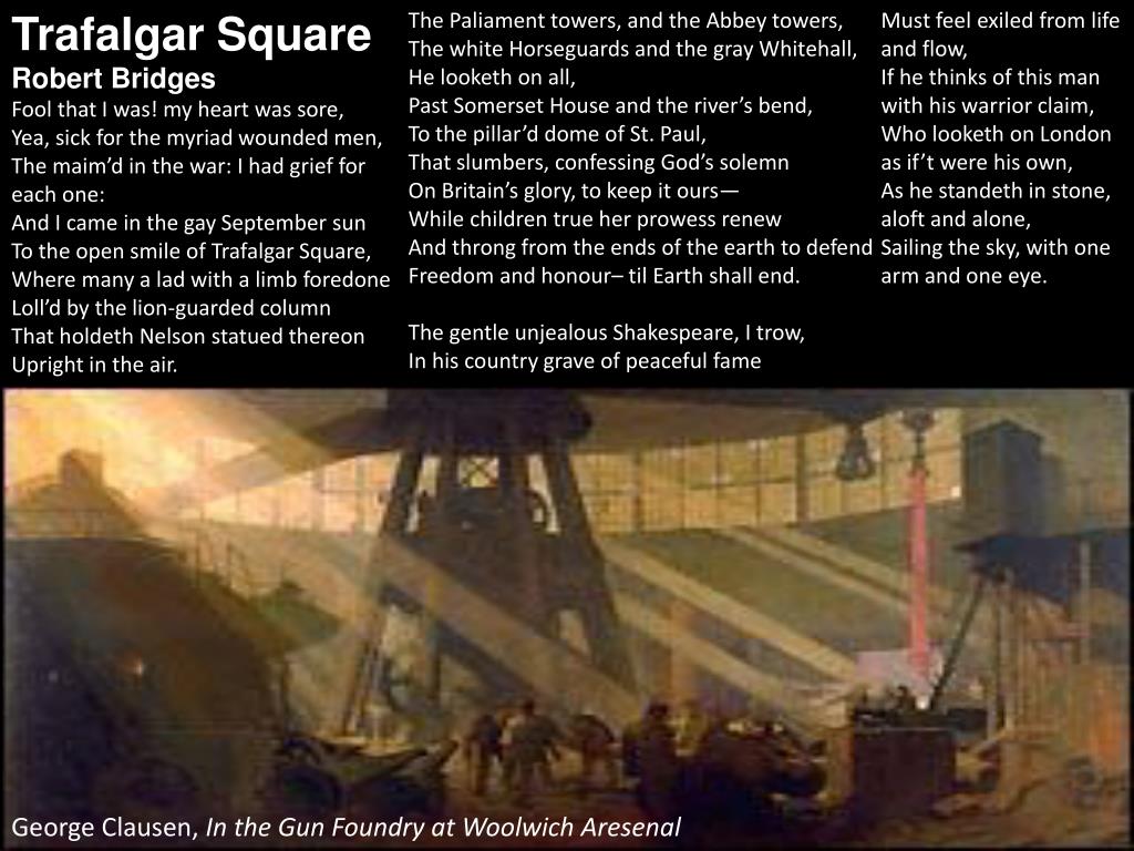 Trafalgar Square Robert Bridges Fool that I was! my heart was sore, Yea, sick for the myriad wounded men, The maim’d in the war: I had grief for each one: And I came in the gay September sun To the open smile of Trafalgar Square, Where many a lad with a limb foredone Loll’d by the lion-guarded column That holdeth Nelson statued thereon Upright in the air. The Paliament towers, and the Abbey towers, The white Horseguards and the gray Whitehall, He looketh on all, Past Somerset House and the river’s bend, To the pillar’d dome of St. Paul, That slumbers, confessing God’s solemn On Britain’s glory, to keep it ours— While children true her prowess renew And throng from the ends of the earth to defend Freedom and honour– til Earth shall end. The gentle unjealous Shakespeare, I trow, In his country grave of peaceful fame Must feel exiled from life and flow, If he thinks of this man with his warrior claim, Who looketh on London as if’t were his own, As he standeth in stone, aloft and alone, Sailing the sky, with one arm and one eye. George Clausen, In the Gun Foundry at Woolwich Aresenal