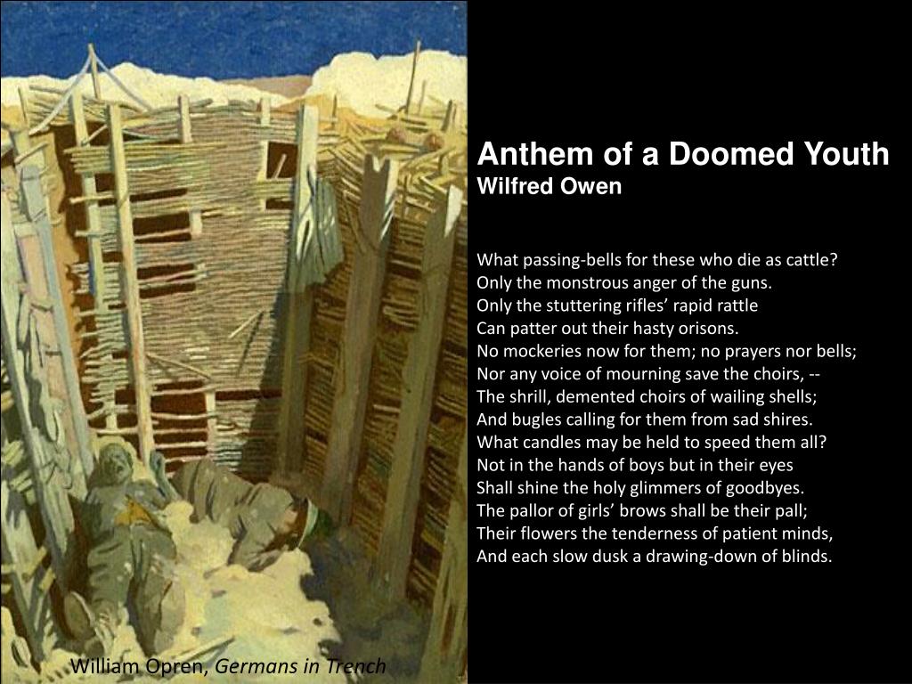 Anthem of a Doomed Youth Wilfred Owen What passing-bells for these who die as cattle? Only the monstrous anger of the guns. Only the stuttering rifles’ rapid rattle Can patter out their hasty orisons. No mockeries now for them; no prayers nor bells; Nor any voice of mourning save the choirs, -- The shrill, demented choirs of wailing shells; And bugles calling for them from sad shires. What candles may be held to speed them all? Not in the hands of boys but in their eyes Shall shine the holy glimmers of goodbyes. The pallor of girls’ brows shall be their pall; Their flowers the tenderness of patient minds, And each slow dusk a drawing-down of blinds. William Opren, Germans in Trench