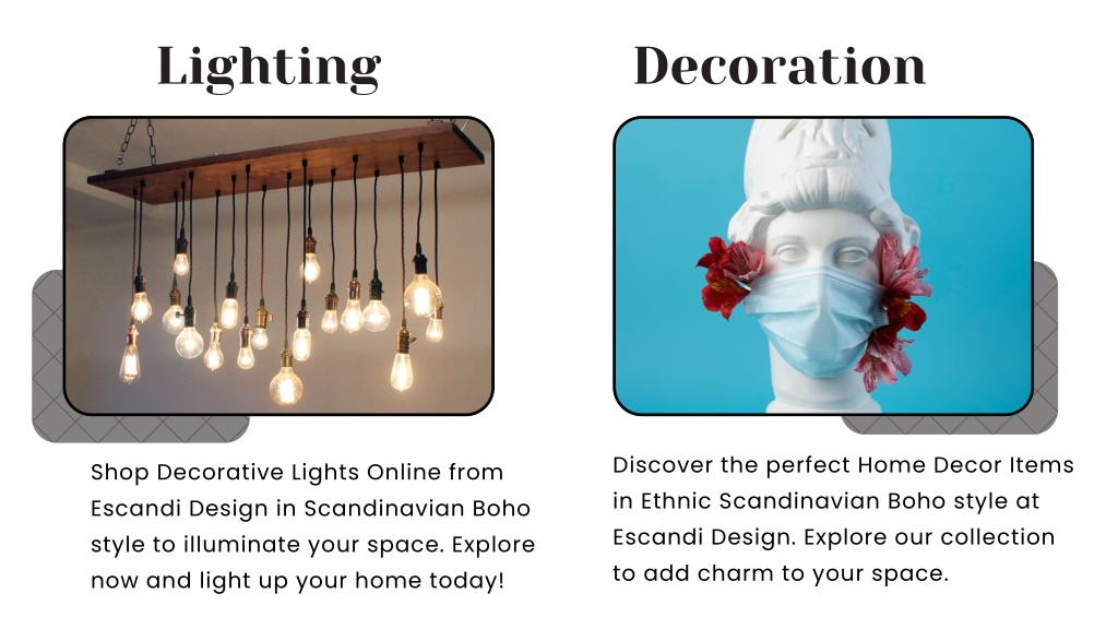 6. Lighting Decoration Discover the perfect Home Decor Items in Ethnic Scandinavian Boho style at Escandi Design. Explore our collection to add charm to your space. Shop Decorative Lights Online from Escandi Design in Scandinavian Boho style to illuminate your space. Explore now and light up your home today!