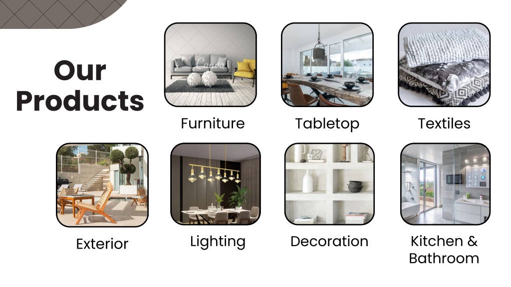 3. Our Products Furniture Tabletop Textiles Kitchen & Bathroom Lighting Decoration Exterior