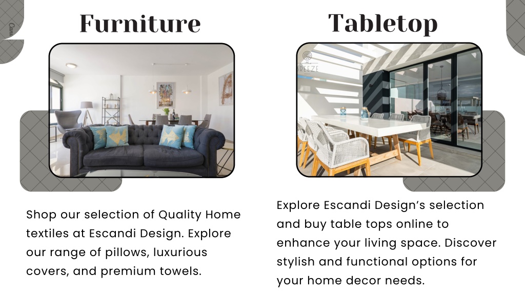 4. Tabletop Furniture Explore Escandi Design’s selection and buy table tops online to enhance your living space. Discover stylish and functional options for your home decor needs. Shop our selection of Quality Home textiles at Escandi Design. Explore our range of pillows, luxurious covers, and premium towels.