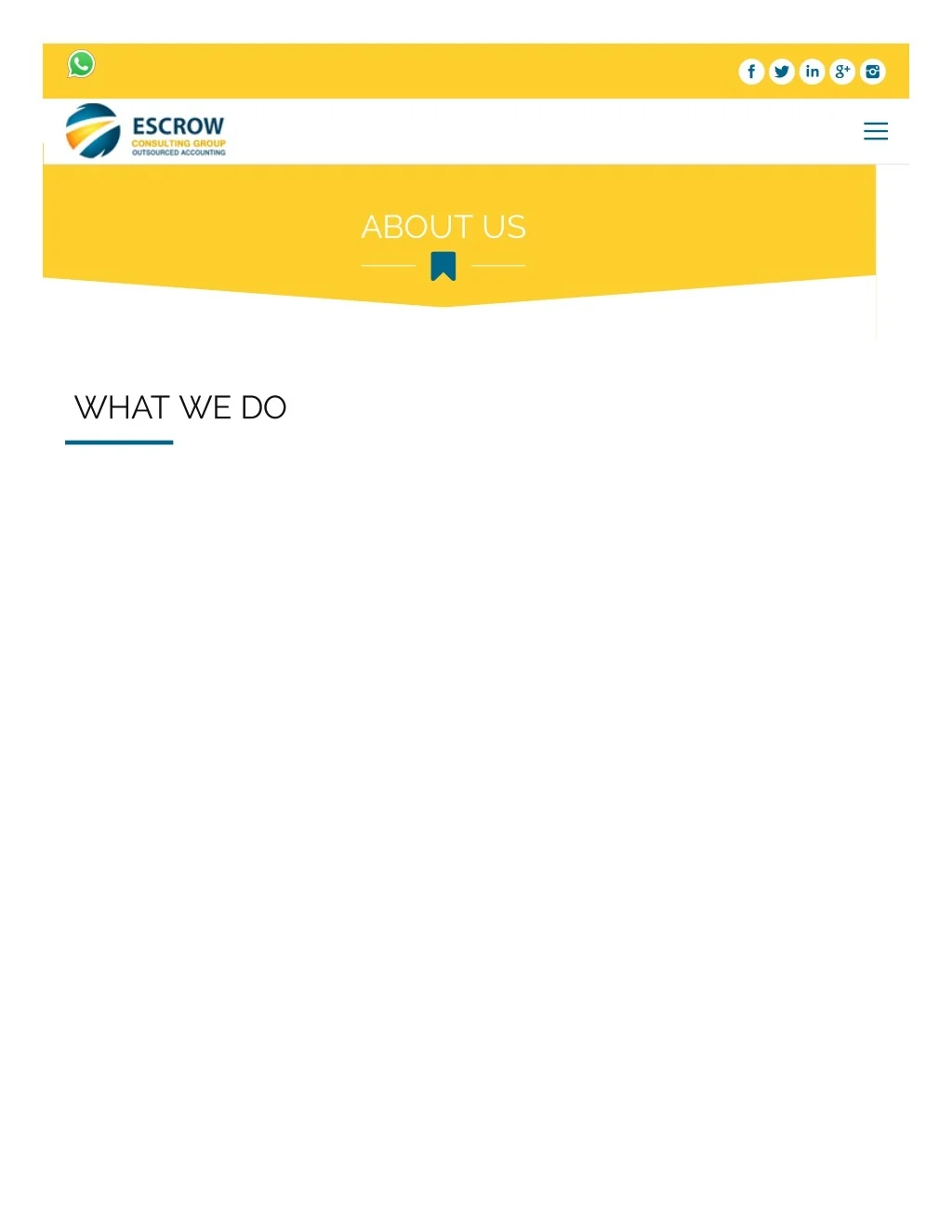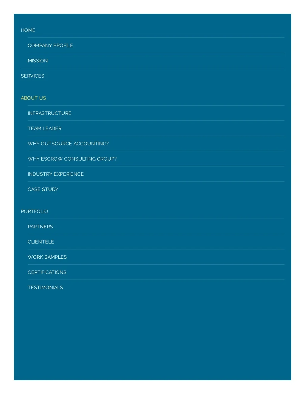 HOME COMPANY PROFILE MISSION SERVICES ABOUT US INFRASTRUCTURE TEAM LEADER WHY OUTSOURCE ACCOUNTING? WHY ESCROW CONSULTING GROUP? INDUSTRY EXPERIENCE CASE STUDY PORTFOLIO PARTNERS CLIENTELE WORK SAMPLES CERTIFICATIONS TESTIMONIALS