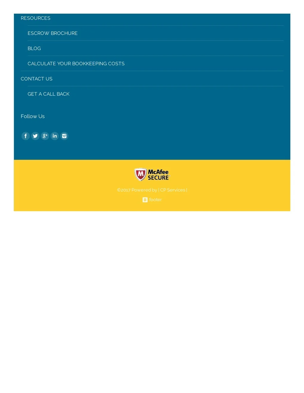 RESOURCES ESCROW BROCHURE BLOG CALCULATE YOUR BOOKKEEPING COSTS CONTACT US GET A CALL BACK Follow Us ©2017 Powered by | CP Services | footer