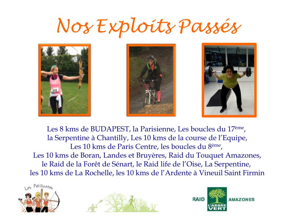 Nos Exploits Passés Les 8 kms de BUDAPEST, la Parisienne, Les boucles du 17ème, la Serpentine à Chantilly, Les 10 kms de la course de l’Equipe, Les 10 kms de Paris Centre, les boucles du 8ème, Les 10 kms de Boran, Landes et Bruyères, Raid du Touquet Amazones, le Raid de la Forêt de Sénart, le Raid life de l’Oise, La Serpentine, les 10 kms de La Rochelle, les 10 kms de l’Ardente à Vineuil Saint Firmin