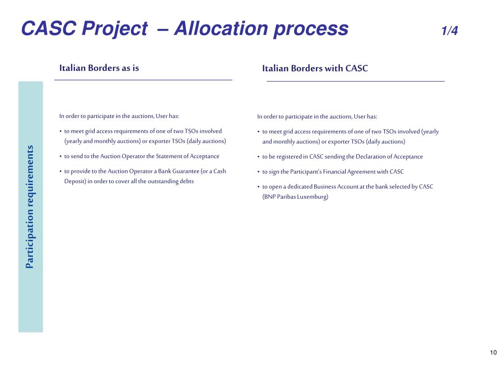 Auction Rules 2011 (first phase till CASC start date) • Minor Changes in AR 2011 for Yearly, Monthly and Daily Auctions • Preamble of AR will contain a reference that during the year 2011 the allocation process will be managed by CASC • Start up of Market Coupling between Italy and Slovenia (in annex) • New Statement of Acceptance by market participants, to be signed from 1 January 2010, including their undertaking that AR can be modified in the course of the year and their acceptance that their bank guarantee could potentially turn into cash deposit.