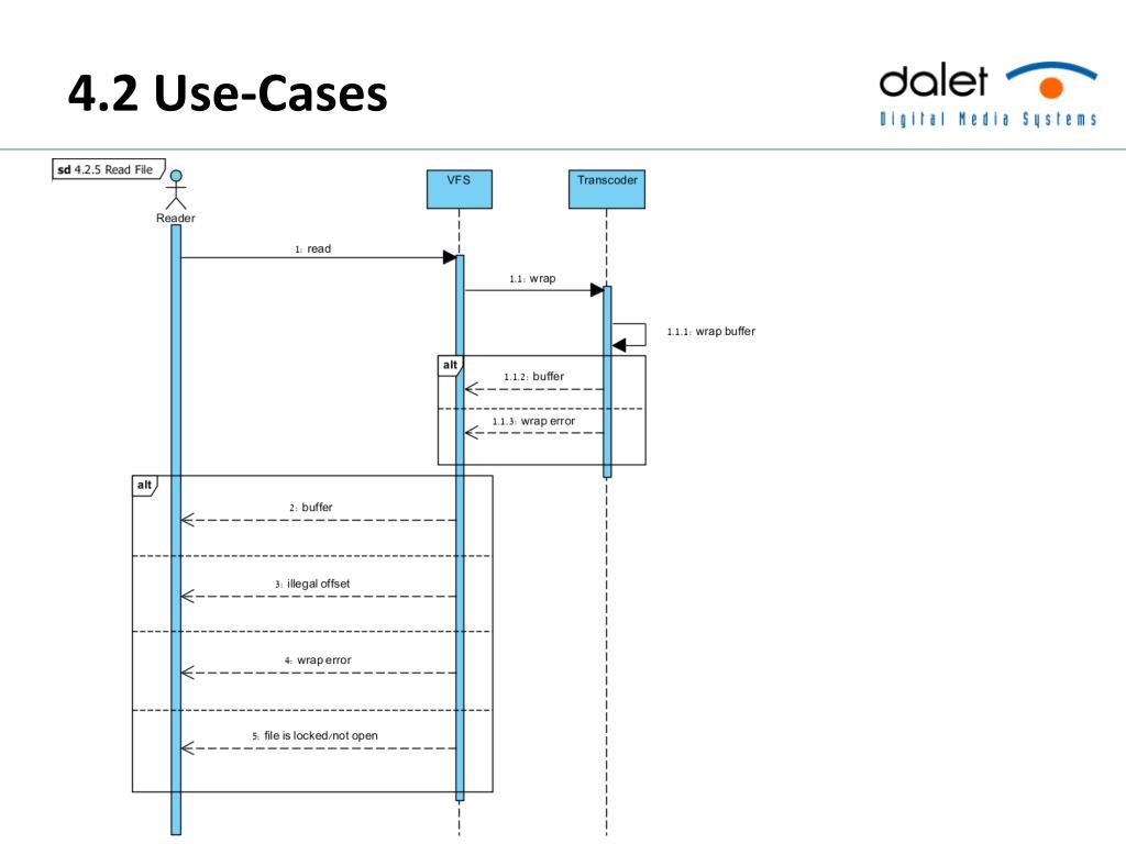 4.2 Use-Cases • Name of used case: 4.2.6 Write file • Main Actor: Writer • Short description: A file was asked to be written from offset OFFSET and for a buffer length of N • Pre-Conditions: • The file is open. • Buffer contains interleaved video data • The Transcoder can unwrap the video data • Post-Conditions: The file is written in Dalet's storage in elementary files format. • Normal course of events: • 1. Writer: requests to write data to a previously opened file. • 2. The system: unwraps the given video file and stores it in the storage unit • Alternative course 1:The file is locked(because of real or virtual file system):return to the upper FS layer a "FILE_IS_CURRENTLY_LOCKED_ERROR" • Alternative course 2:File not open:An file not open error will return. • Alternative course 3:Unwrapping error:cannot unwrap buffer (input is corrupted). returns cannot convert data error.