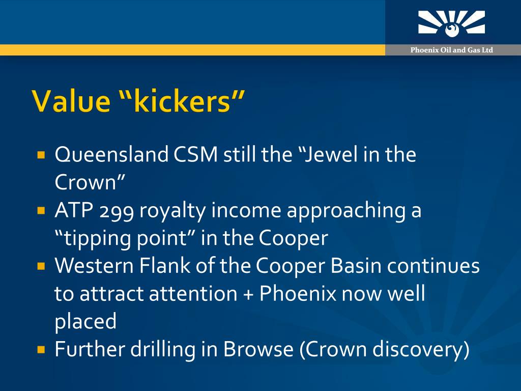 Value “kickers” • Queensland CSM still the “Jewel in the Crown” • ATP 299 royalty income approaching a “tipping point” in the Cooper • Western Flank of the Cooper Basin continues to attract attention + Phoenix now well placed • Further drilling in Browse (Crown discovery)