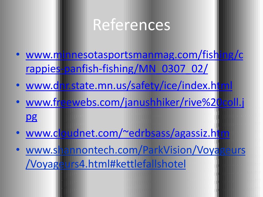 References • www.minnesotasportsmanmag.com/fishing/crappies-panfish-fishing/MN_0307_02/ • www.dnr.state.mn.us/safety/ice/index.html • www.freewebs.com/janushhiker/rive%20coll.jpg • www.cloudnet.com/~edrbsass/agassiz.htm • www.shannontech.com/ParkVision/Voyageurs/Voyageurs4.html#kettlefallshotel