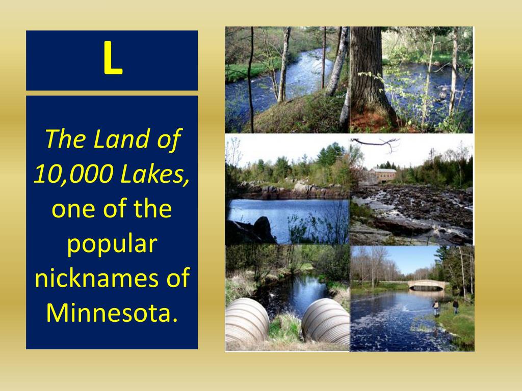 L The Land of 10,000 Lakes, one of the popular nicknames of Minnesota.