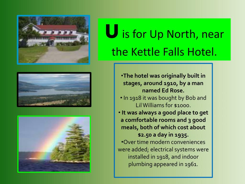 U is for Up North, near the Kettle Falls Hotel. • The hotel was originally built in stages, around 1910, by a man named Ed Rose. • In 1918 it was bought by Bob and Lil Williams for $1000. • It was always a good place to get a comfortable rooms and 3 good meals, both of which cost about $2.50 a day in 1935. • Over time modern conveniences were added; electrical systems were installed in 1918, and indoor plumbing appeared in 1961.