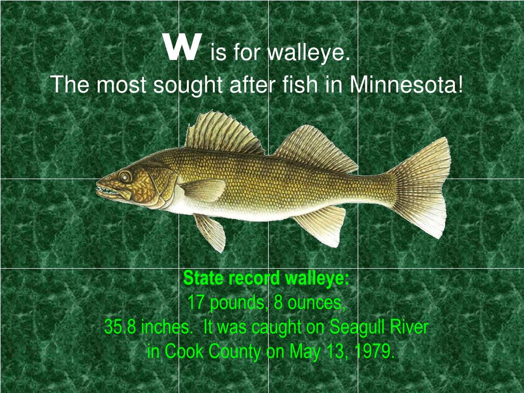 Wis for walleye. The most sought after fish in Minnesota! State record walleye: 17 pounds, 8 ounces, 35.8 inches. It was caught on Seagull River in Cook County on May 13, 1979.