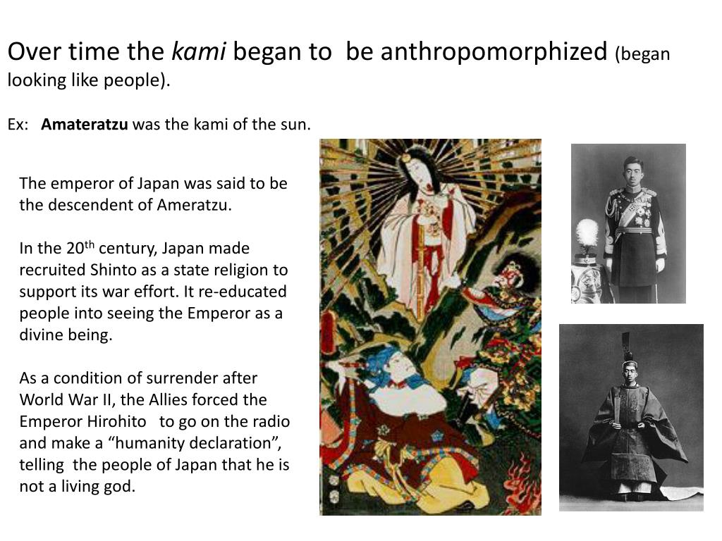 Over time the kami began to be anthropomorphized (began looking like people). Ex: Amateratzu was the kami of the sun. The emperor of Japan was said to be the descendent of Ameratzu. In the 20th century, Japan made recruited Shinto as a state religion to support its war effort. It re-educated people into seeing the Emperor as a divine being. As a condition of surrender after World War II, the Allies forced the Emperor Hirohito to go on the radio and make a “humanity declaration”, telling the people of Japan that he is not a living god.