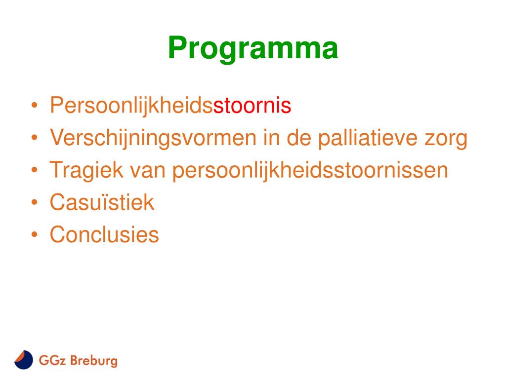 Programma Persoonlijkheidsstoornis Verschijningsvormen in de palliatieve zorg Tragiek van persoonlijkheidsstoornissen Casuïstiek Conclusies