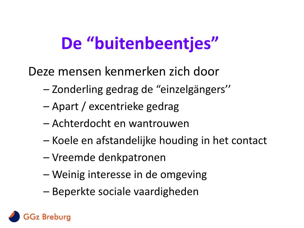 De “buitenbeentjes” • Deze mensen kenmerken zich door • Zonderling gedrag de “einzelgängers’’ • Apart / excentrieke gedrag • Achterdocht en wantrouwen • Koele en afstandelijke houding in het contact • Vreemde denkpatronen • Weinig interesse in de omgeving • Beperkte sociale vaardigheden
