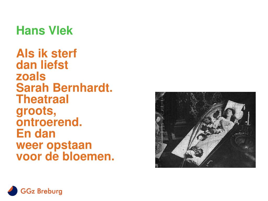 Hans VlekAls ik sterf dan liefst zoals Sarah Bernhardt. Theatraalgroots, ontroerend. En dan weer opstaan voor de bloemen.