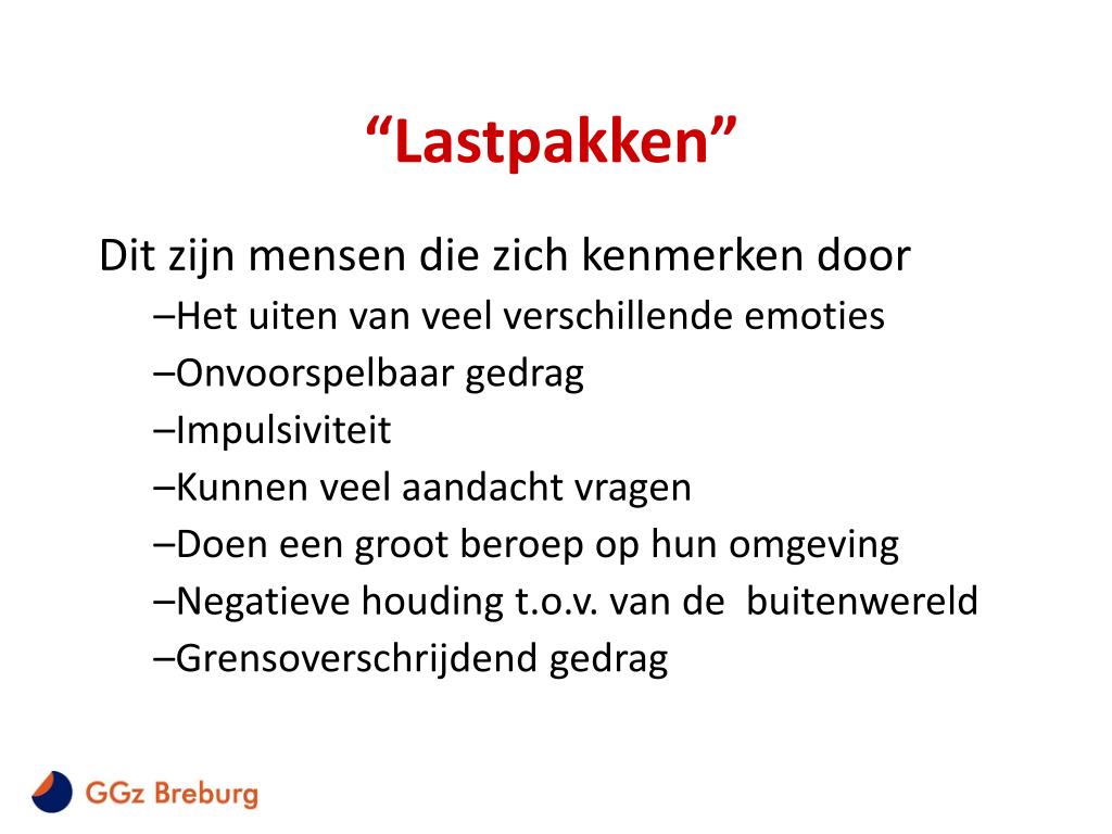 “Lastpakken” • Dit zijn mensen die zich kenmerken door • Het uiten van veel verschillende emoties • Onvoorspelbaar gedrag • Impulsiviteit • Kunnen veel aandacht vragen • Doen een groot beroep op hun omgeving • Negatieve houding t.o.v. van de buitenwereld • Grensoverschrijdend gedrag