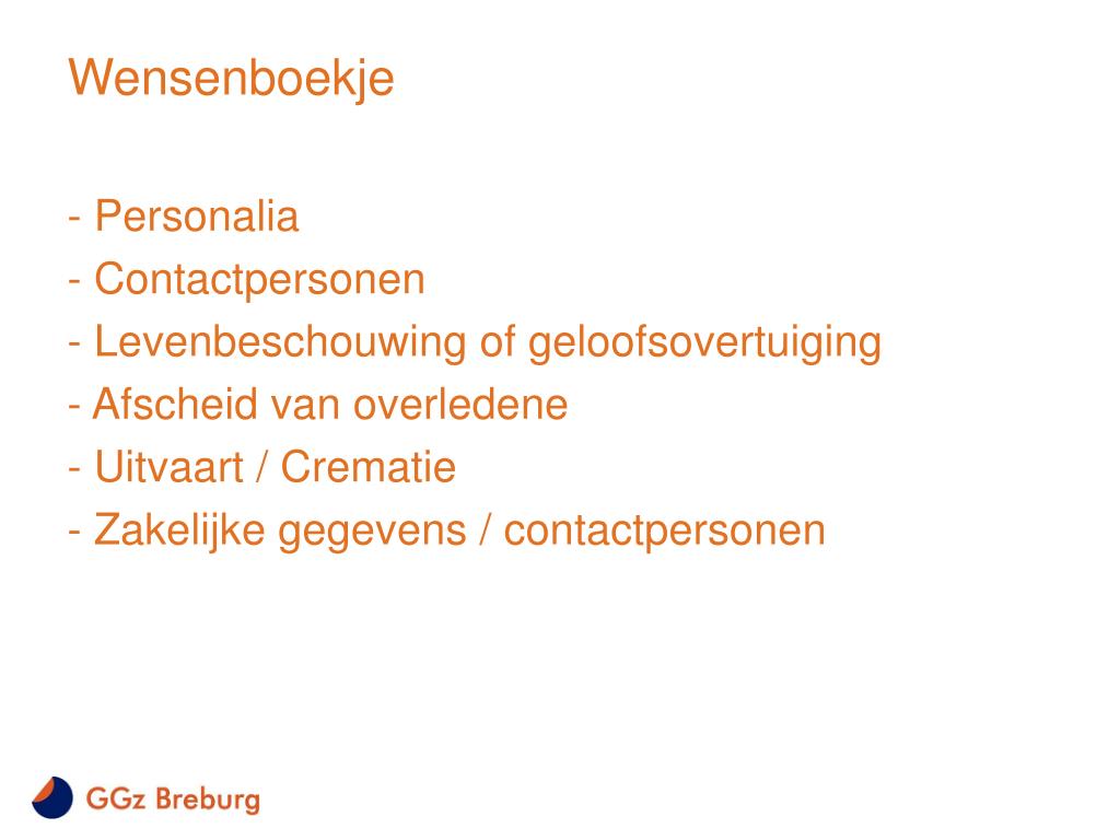 Wensenboekje - Personalia - Contactpersonen - Levenbeschouwing of geloofsovertuiging - Afscheid van overledene - Uitvaart / Crematie - Zakelijke gegevens / contactpersonen