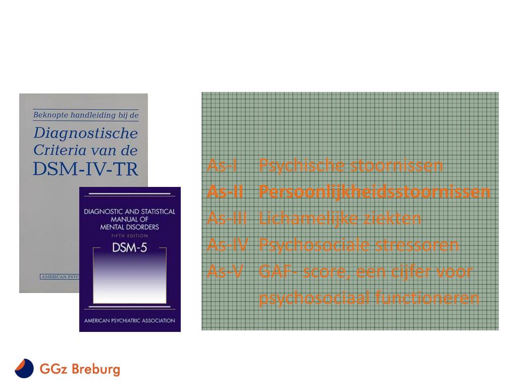 As-I Psychische stoornissen As-II Persoonlijkheidsstoornissen As-III Lichamelijke ziekten As-IV Psychosociale stressoren As-V GAF- score, een cijfer voor psychosociaal functioneren