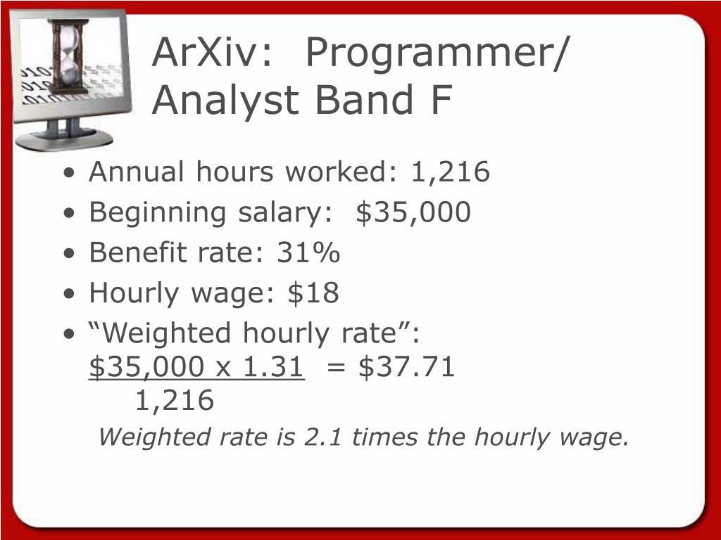 ArXiv: Programmer/ Analyst Band F • Annual hours worked: 1,216 • Beginning salary: $35,000 • Benefit rate: 31% • Hourly wage: $18 • “Weighted hourly rate”: $35,000 x 1.31 = $37.71 1,216 Weighted rate is 2.1 times the hourly wage.