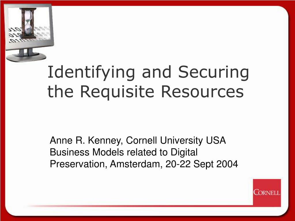 Identifying and Securing the Requisite Resources. Anne R. Kenney, Cornell University USA Business Models related to Digital Preservation, Amsterdam, 20-22 Sept 2004. How do we identify and secure the requisite resources to maintain a digital repository?.