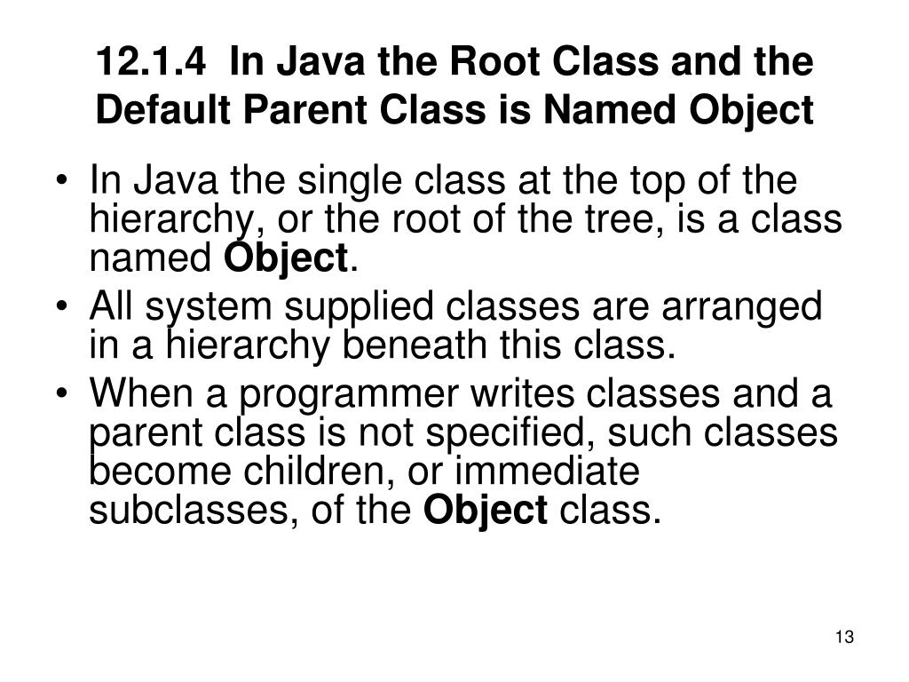 12.1.4 In Java the Root Class and the Default Parent Class is Named Object • In Java the single class at the top of the hierarchy, or the root of the tree, is a class named Object. • All system supplied classes are arranged in a hierarchy beneath this class. • When a programmer writes classes and a parent class is not specified, such classes become children, or immediate subclasses, of the Object class.
