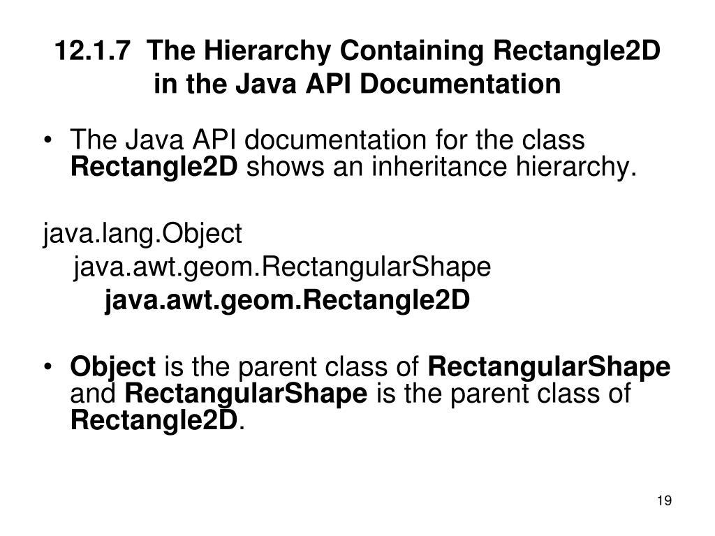 12.1.7 The Hierarchy Containing Rectangle2D in the Java API Documentation • The Java API documentation for the class Rectangle2D shows an inheritance hierarchy. java.lang.Object java.awt.geom.RectangularShape java.awt.geom.Rectangle2D • Object is the parent class of RectangularShape and RectangularShape is the parent class of Rectangle2D.