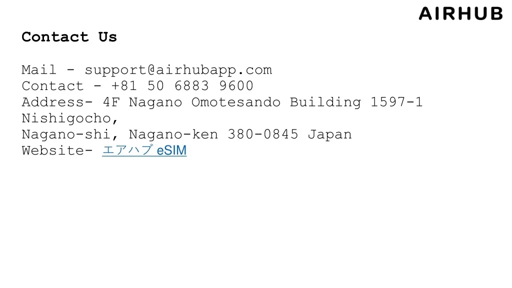 Contact Us Mail - support@airhubapp.com Contact - +81 50 6883 9600 Address- 4F Nagano Omotesando Building 1597-1 Nishigocho, Nagano-shi, Nagano-ken 380-0845 Japan Website- エアハブ eSIM