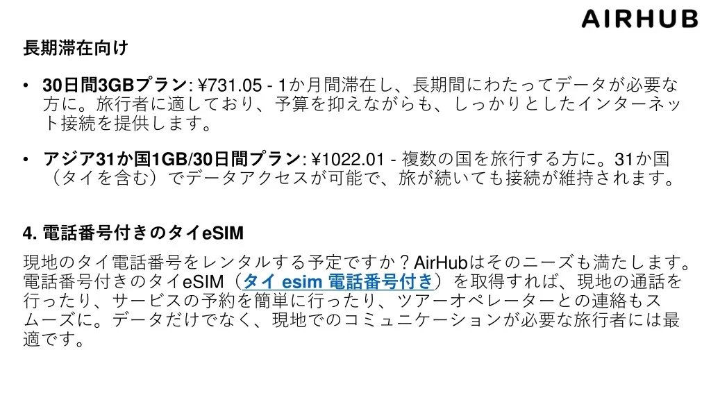 長期滞在向け • 30日間3GBプラン: ¥731.05 - 1か月間滞在し、長期間にわたってデータが必要な 方に。旅行者に適しており、予算を抑えながらも、しっかりとしたインターネッ ト接続を提供します。 • アジア31か国1GB/30日間プラン: ¥1022.01 - 複数の国を旅行する方に。31か国 (タイを含む)でデータアクセスが可能で、旅が続いても接続が維持されます。 4. 電話番号付きのタイeSIM 現地のタイ電話番号をレンタルする予定ですか?AirHubはそのニーズも満たします。 電話番号付きのタイeSIM(タイ esim 電話番号付き)を取得すれば、現地の通話を 行ったり、サービスの予約を簡単に行ったり、ツアーオペレーターとの連絡もス ムーズに。データだけでなく、現地でのコミュニケーションが必要な旅行者には最 適です。