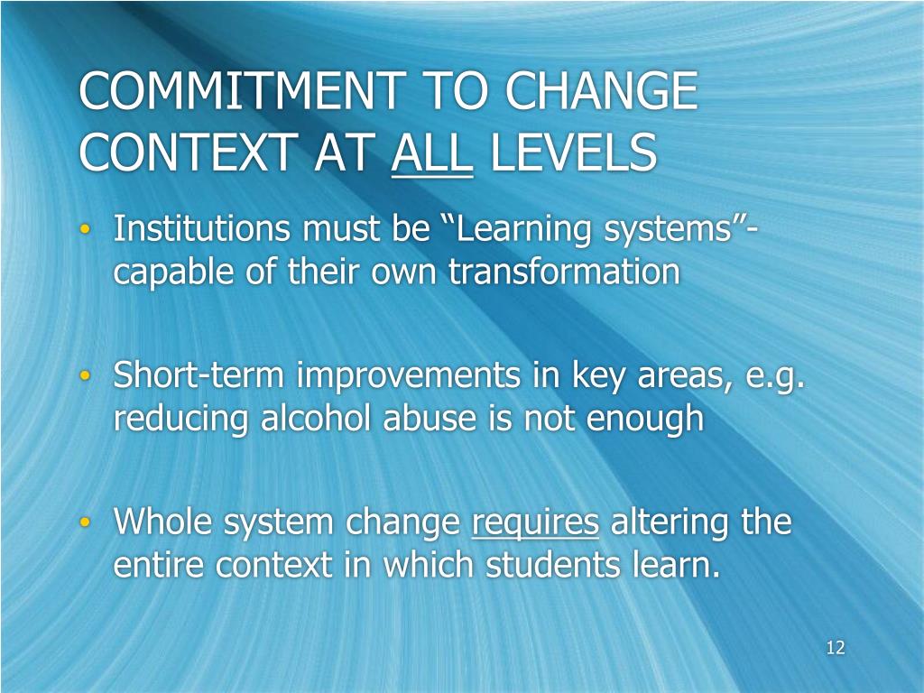 COMMITMENT TO CHANGE CONTEXT AT ALL LEVELS • Institutions must be “Learning systems”-capable of their own transformation • Short-term improvements in key areas, e.g. reducing alcohol abuse is not enough • Whole system change requires altering the entire context in which students learn.