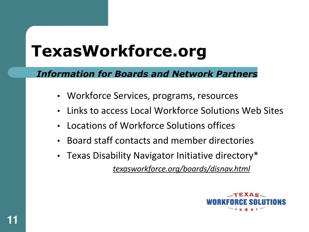 TexasWorkforce.org Information for Boards and Network Partners • Workforce Services, programs, resources • Links to access Local Workforce Solutions Web Sites • Locations of Workforce Solutions offices • Board staff contacts and member directories • Texas Disability Navigator Initiative directory* texasworkforce.org/boards/disnav.html