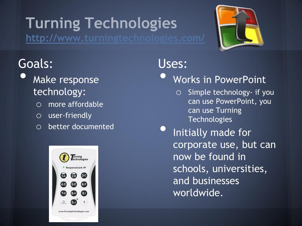 Turning Technologies http://www.turningtechnologies.com/ Goals: • Make response technology: • more affordable • user-friendly • better documented Uses: • Works in PowerPoint • Simple technology- if you can use PowerPoint, you can use Turning Technologies • Initially made for corporate use, but can now be found in schools, universities, and businesses worldwide.